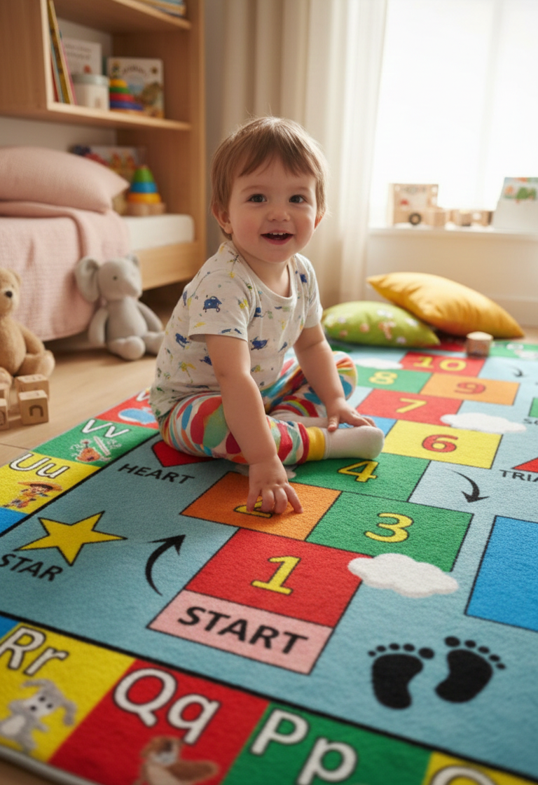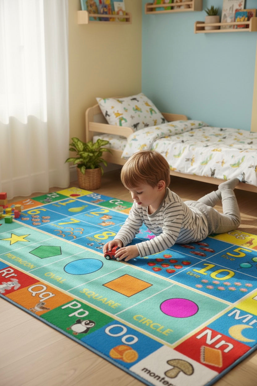 Çocuk odalarını renklendiren bu halı ile öğrenmek artık çok daha keyifli! Alfabe, sayılar ve şekillerle dolu bu tasarım, oyun saatini eğitim saatine dönüştürür.
